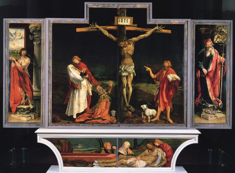 Señalando a otra persona: esto es lo que hace esa intrigante figura vestida en piel de camello en el Retablo de Isenheim (S. XVI) que se expone en Colmar, Francia. Con el brazo doblado, se yergue para señalar a otra figura colgando de una viga de madera, la piel cubierta de llagas, espinas afiladas sobre su cabeza y sin color en los labios.